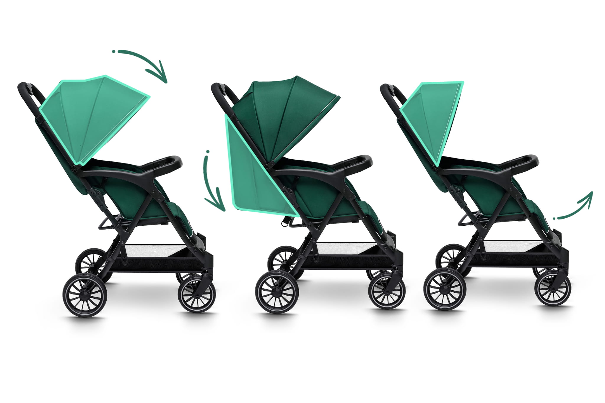 - Copertină mare, reglabilă – protejează de soare, vânt și ploaie